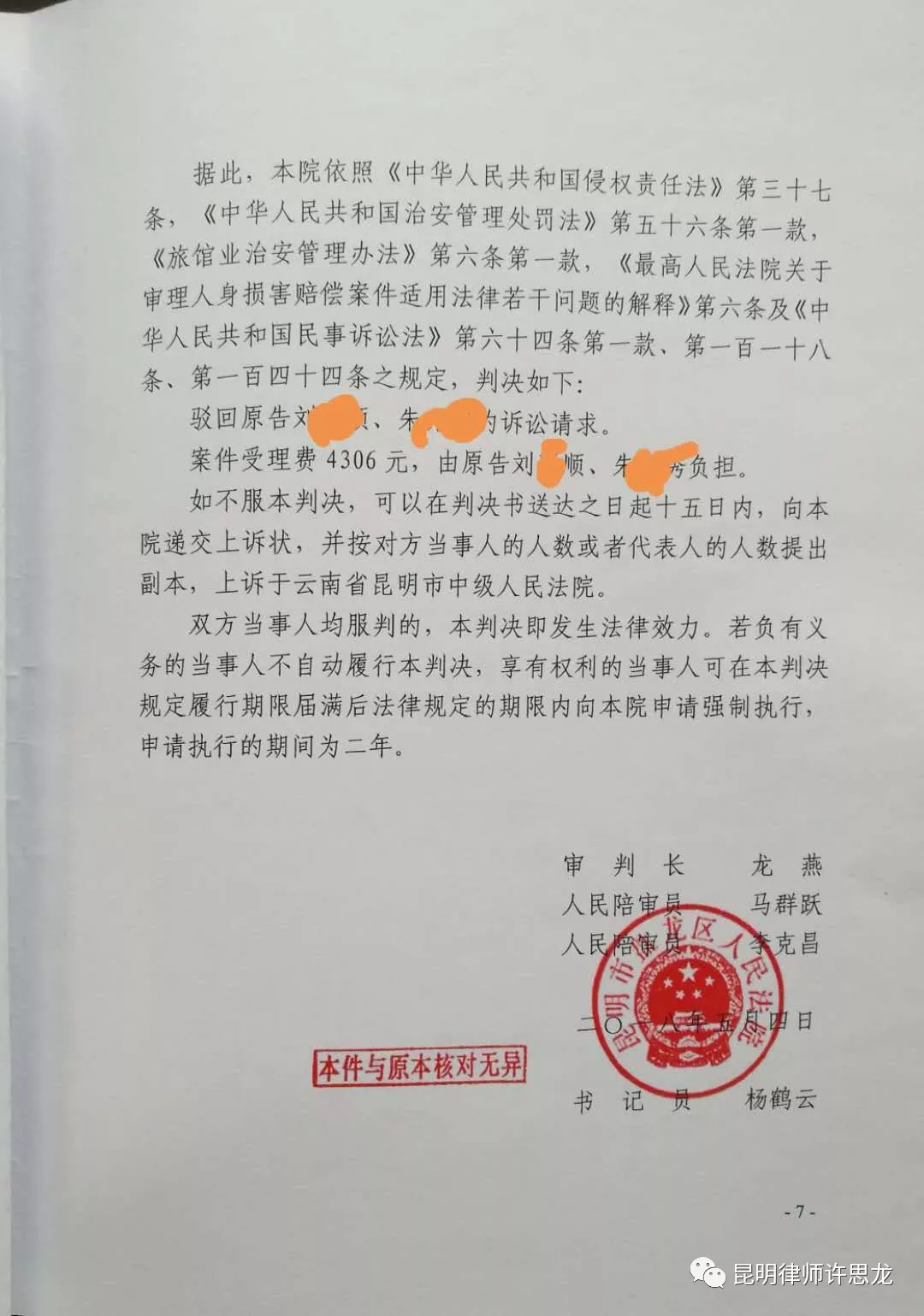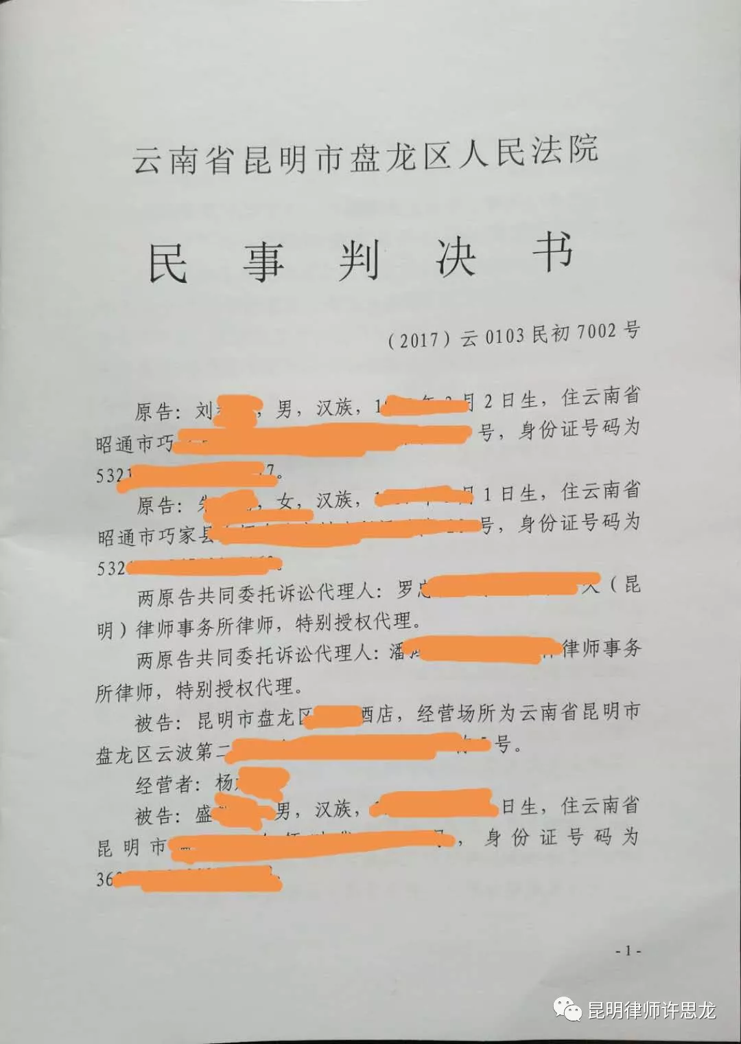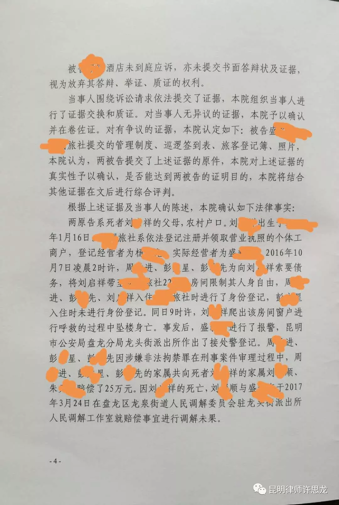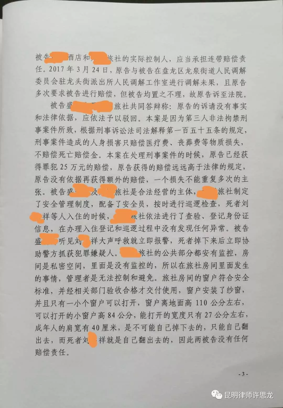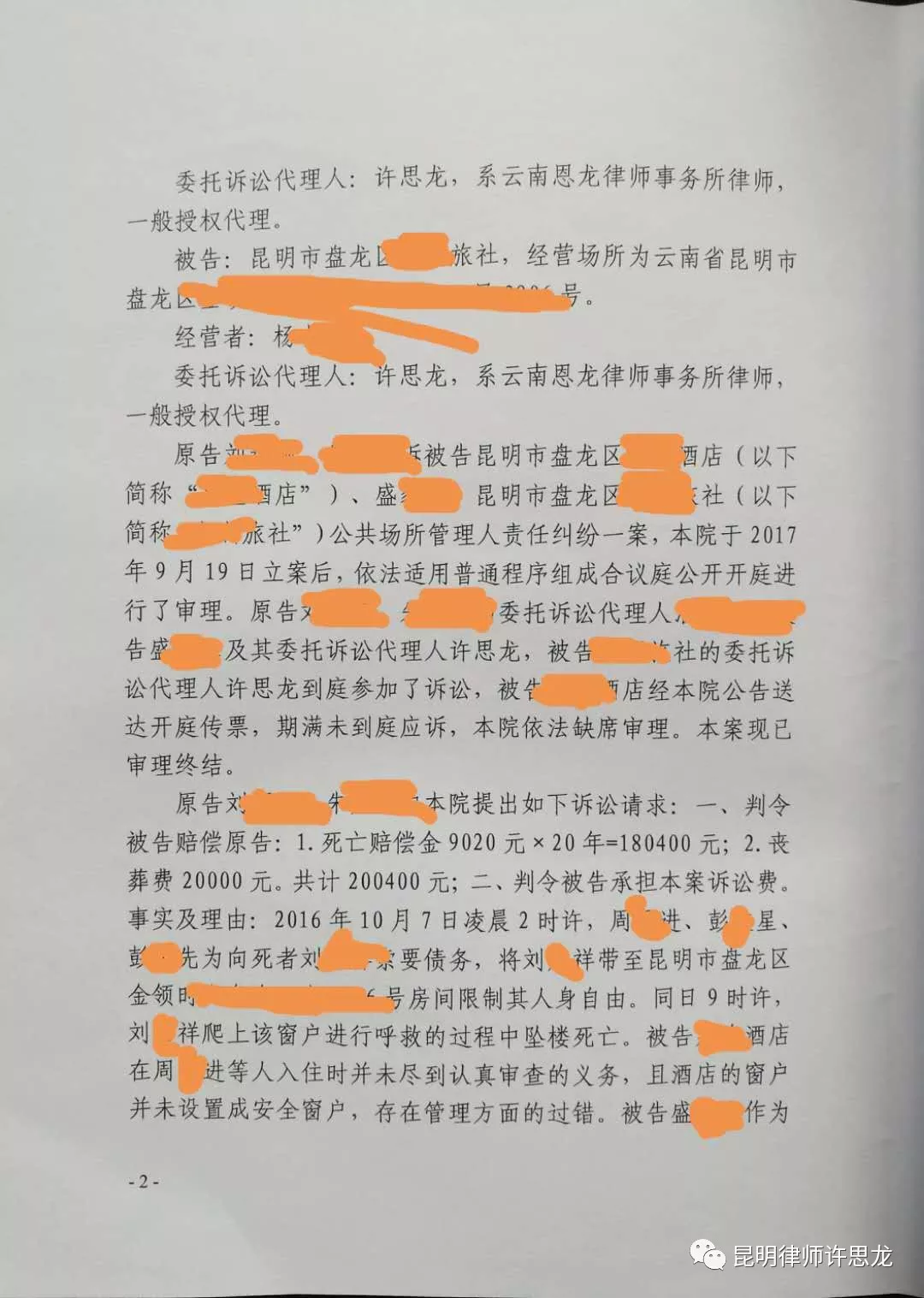 2017年9月19日,死者刘某祥的父母将某某旅社及其实际经营者盛某某告上昆明市盘龙区法院,要求被告赔偿死亡赔偿金、丧葬费等20余万元。某某旅社、盛某某为维护自身合法权益,通过朋友推荐,委托云南恩龙律师事务所许思龙律师代理本案。