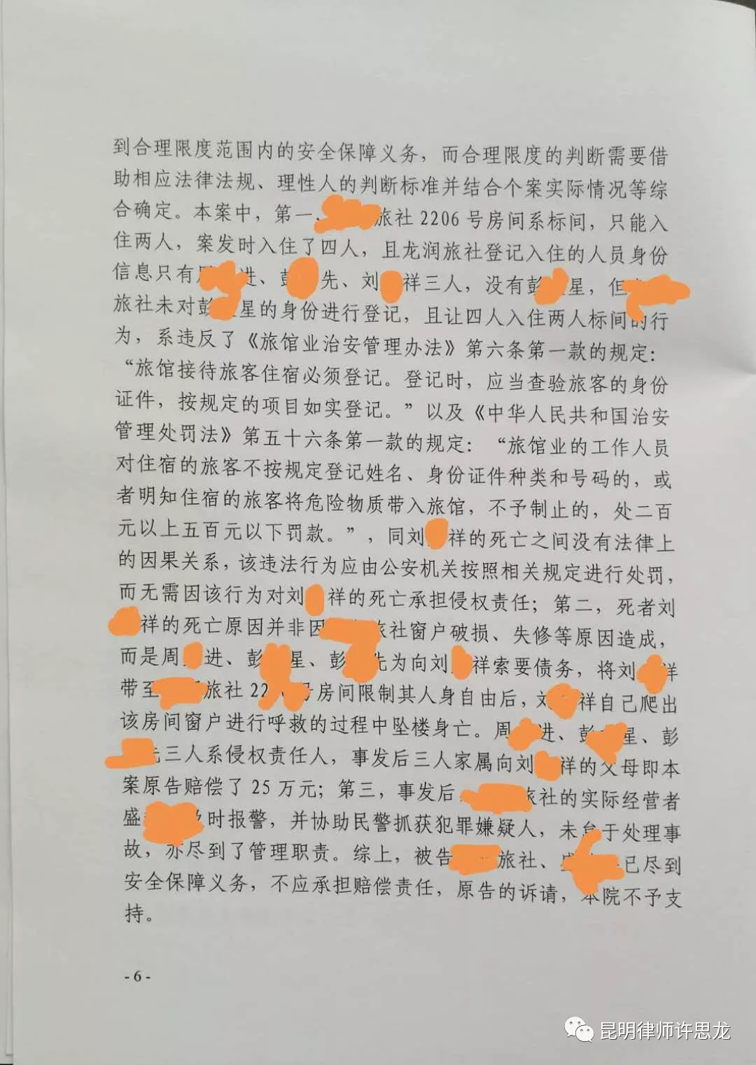 通过大量翔实、充分的准备,许思在律师在法庭上根据证据和法律,对原告的诉讼请求、理由进行了有理有据的辩驳。许律师提出:第一、原告儿子死亡一事已获得远超过法律规定的赔偿,原告系重复主张、重复起诉,应驳回其诉讼请求;第二、某某旅社已尽到法律规定的安全保障义务,没有任何过错,不应承担任何赔偿或补偿责任;第三、安全保障义务人承担补充赔偿责任必须同时具备以下条件:一是被害方未获得加害人赔偿;二是安全保障义务人有过错;三是安全保障义务人能防止或制止损害的发生。安全保障义务人承担责任后,还可以向加害人追偿。本案一个条件都不具备。在有第三人侵权的情况下,最终赔偿责任应由加害人承担。但本案中加害人已进行了充分的赔偿。若再判决被告承担补充赔偿责任,被告还能找加害人追偿吗?显然不能。若判决被告赔偿,必然侵犯被告的追偿权。据此,要求法院驳回原告的诉讼请求。