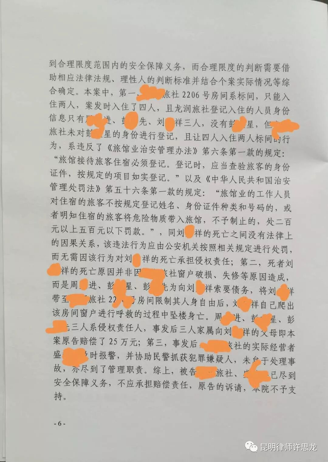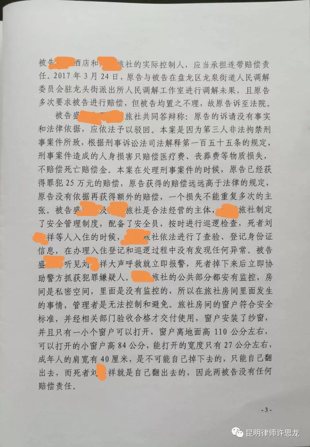 2017年9月19日,死者刘某祥的父母将某某旅社及其实际经营者盛某某告上昆明市盘龙区法院,要求被告赔偿死亡赔偿金、丧葬费等20余万元。某某旅社、盛某某为维护自身合法权益,通过朋友推荐,委托云南恩龙律师事务所许思龙律师代理本案。